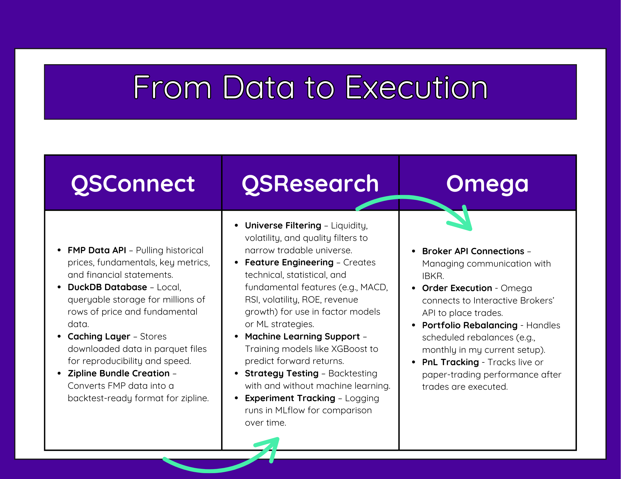 From Data to Execution diagram showing QSConnect (FMP/DuckDB ingest), QSResearch (feature engineering & MLflow backtests), and Omega (IBKR execution, rebalancing, P&L).